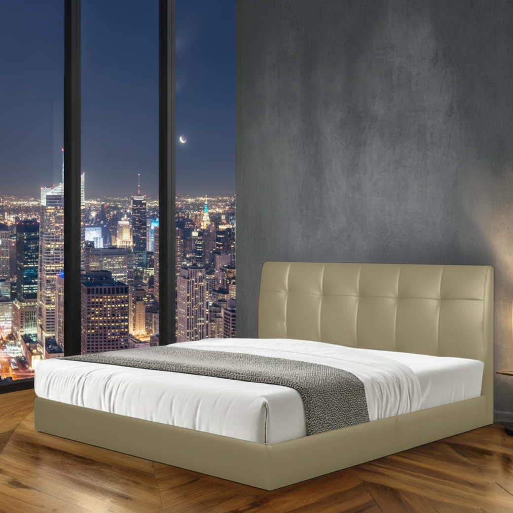 • Solid Meranti Wood Bedframe Construction. • Easy-Clean and Pet/Child Friendly Linen Fabric.